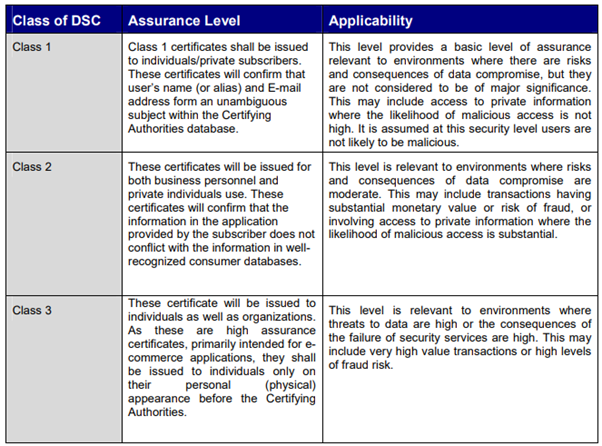 Depending upon the requirement of assurance level and usage of DSC the following are the classes of Digital Signature Certificates