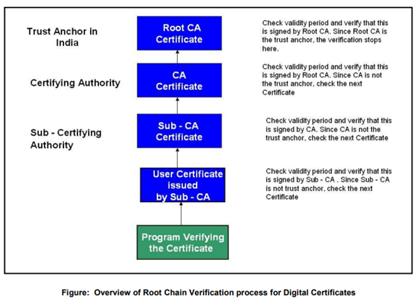 Digital Signature Certificates are verified using a Chain of trust. The trust anchor for the Digital Certificate is the Root Certifying Authority (CCA in India). A root certificate is the top-most certificate of the hierarchy, the private key of which is used to “sign” other certificates. All certificates immediately below the root certificate inherit the trustworthiness of the root certificate. Certificates further down the tree also depend on the trustworthiness of the intermediates (often known as “subordinate certification authorities”). The Digital Certificate verification process is a recursive process in which the program verifying the end user certificate verifies the validity of the certificate of the issuing authority until it finds a valid certificate of a trusted party. On successful verification of the trusted party Certificate, the Digital Certificate verification stops. In case a trusted party Certificate is not found by the program, the Digital Certificate verification process ends in failure.